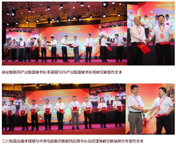 本次大会共同见证了几个历史性的时刻。一为鹰潭市市委副书记、市政府党组书记于秀明为入园注册企业代表发证;二为中国移动物联网产业发展史上一次强有力的握手,战略合作伙伴交换签约文本:作为移动物联网产业联盟秘书长及安博电子_安博电子(中国)总裁的李强祖分别与TD产业联盟秘书长杨骅、中国电信集团物联网运营中心总经理孙健上台交换签约文本;三为揭牌仪式:中国信通院院长刘多,鹰潭市委副书记、市政府党组书记于秀明共同为“中国信息通信研究院物联网研究中心(鹰潭)”揭牌;国家信息化专家咨询委员会常务副主任、移动物联网产业联盟理事长周宏仁,国家工信部科技司司长陈因,江西省工信委副主任王亦斌共同为“移动物联网产业联盟”揭牌;国家工信部原党组成员、纪检组长金书波,江西省人民政府副省长李贻煌,鹰潭市市委书记、市长曹淑敏共同为“中国鹰潭移动物联网产业园”揭牌。